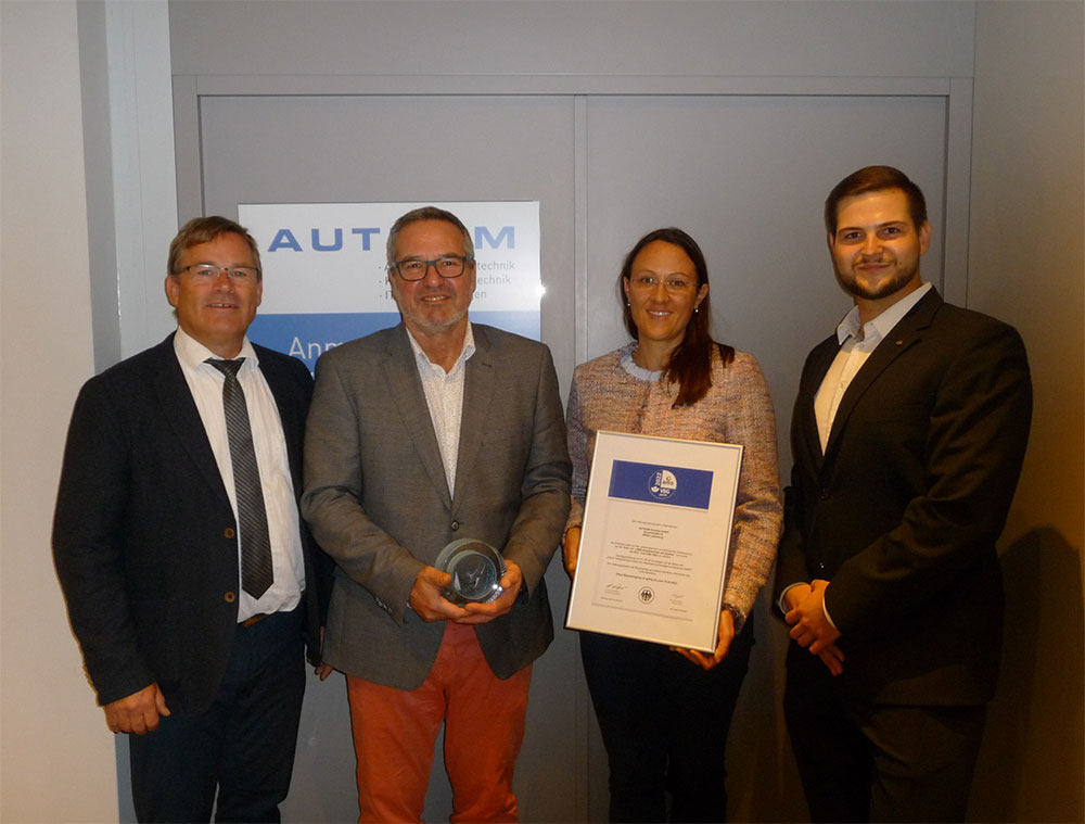 Freude bei der Übergabe der AMS-Bescheinigung (v. l. n. r.): Georg Krämer (VBG), Thomas Eichhorn (AUTKOM), Silke Gutzeit-Hummel (VBG) und Martin Franke (AUTKOM).